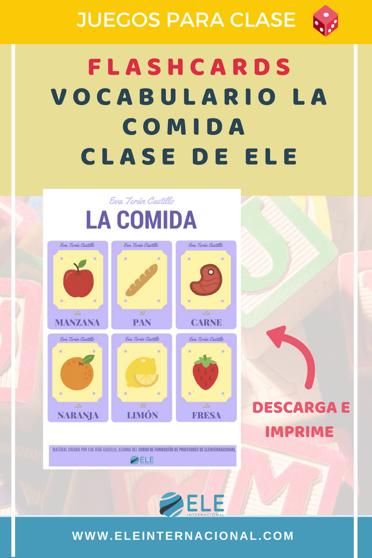 He preparado una baraja de cartas para practicar el vocabulario de la comida en clase de español. En ella aparecen una serie de alimentos con su nombre y el artículo correspondiente. Para jugar con estas cartas propongo hacer una variante del ya conocido “Memory”. Las reglas y el desarrollo serían el mismo: se jugaría con dos barajas, mezclando todas las cartas y colocándolas boca abajo, y se irían levantando por turnos para encontrar las parejas iguales. Sin embargo, cada vez que un jugador consiguiese encontrar una pareja, tendría que decir una característica de ese alimento.